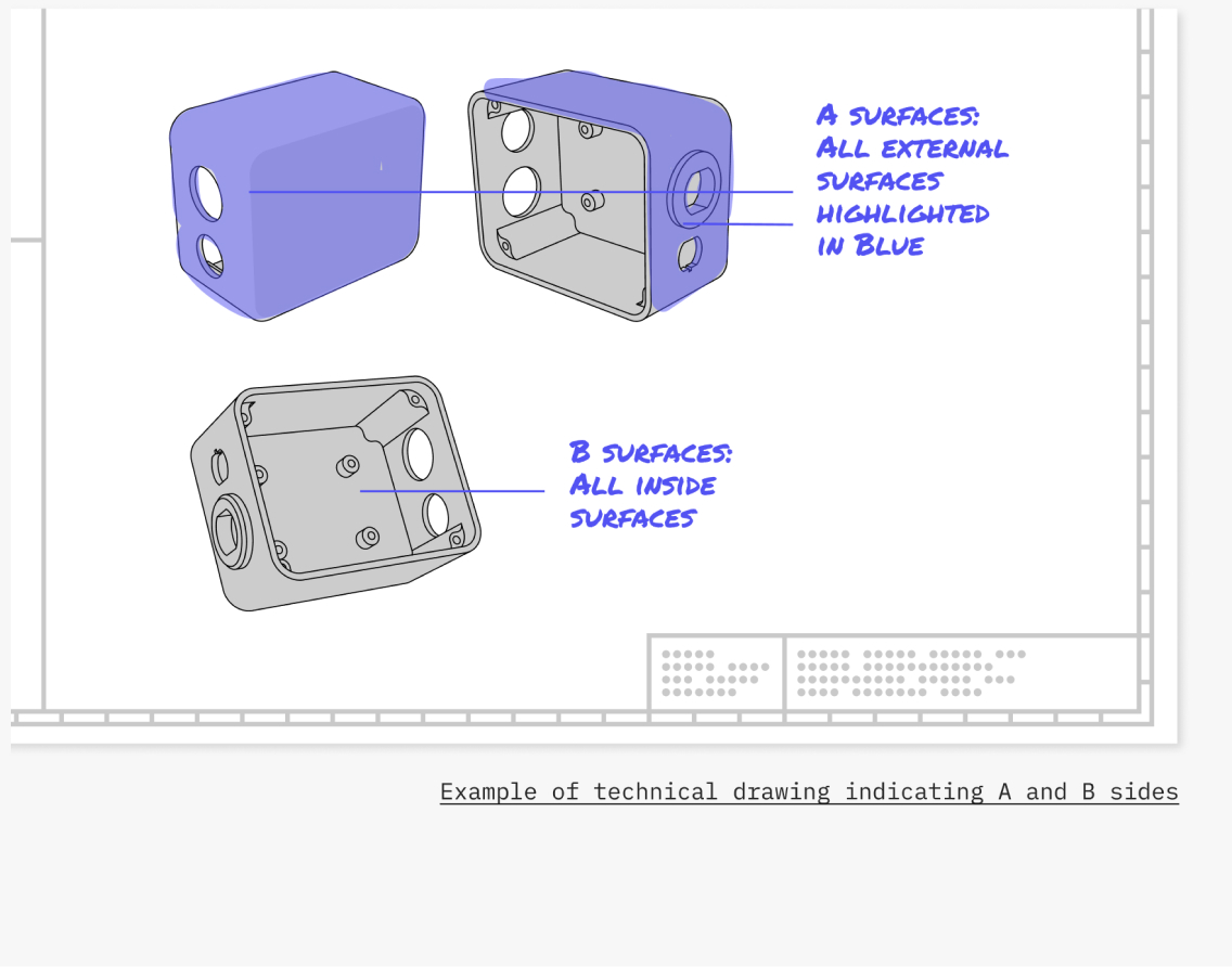 For the primary surface (A-side) of your part, we guarantee defect-free production. In contrast, secondary surfaces (B-side) may be machined with hanging marks and other minor defects. B-side surfaces, like the rest of your part, will be free of scratches, stains and blemishes.